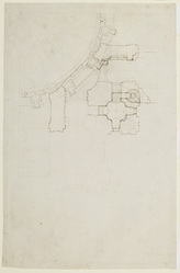 - BeskrivningUnfinished quarter-plan of the crossing at church floor and dome levels. Drawn by Wren. Datable 1675 (pre-construction). Drawn scale, c.11.5 ft to 1 inch (100 ft = 217.5 mm) along the bottom of sheet, assuming it was orientated with east at the top. The dome in this study is preparatory for a larger version in a neatly drawn diagonal section through the crossing at All Souls, known as the ‘Penultimate design’ (Geraghty 2007, no.77). Radial ruled pencil lines mark the angles of a 16-sided drum and those of the octagonal crossing space. Within the octagon a circle marks the inner face of the drum above the crossing arches; it is 54 ft in radius, as built. Dotted ink lines mark the base of the inner dome, with windows in each bay; in the All Souls section these are oval in shape. Circles on the pier masses probably indicate voids to lighten the structure and provide staircase access. The drum of the dome is about 3 ft thick and is buttressed by pier masses that reach 11 ft beyond the inner face of the drum, giving an overall external width of 130 ft for the drum and buttresses. Sketched in pencil beyond the 16-bay outline is part of a larger octagonal base, about 2 ft wider overall. In the All Souls drawing the shell of the drum is about 4 ft thick and the buttresses give an external width of 140 ft. The plan at church-floor level explores the configuration of the bastion, crossing piers, vaulted diagonal bay, aisle walls and transept. The main outlines are marked with ruled pencil lines. Wren has retained the Warrant design’s overall width of 120 ft to the outer walls (1 ft less than the built plan) but redistributed the wall, aisle and pier widths to accommodate a dome which rises vertically from the crossing piers on a cylindrical drum, rather than curving inwards to a narrower drum raised high above the crossing space. His adjustments included thickening the outer walls from 9 ft to 10ft and narrowing the aisles from 19 ft to 18 ft. The crossing piers are still in flux. Wren lengthened the upper pier in the ink drawing, and widened its wall mass to about 9 ft 3 inches. The piers were built about 8 ft 9 inches thick; see WRE/2/2/9. Pencilled additions show him thickening the piers and bastion walls still further by building out the paired pilasters towards the aisles to carry saucer domes in the tunnel vaults. At the next stage, WRE/2/2/6, he retained the outer wall and aisle dimensions of this plan but reduced the overall width to about 119 ft. The Dean’s Vestry in the south-east bastion is drawn circular in plan rather than octagonal and the spiral staircase is on the inner rather than the outer angle of the bastion. The staircase passage is rectangular rather than splayed and the lower threshold is deeper than built. On the right side of sheet is a pencil sketch of a narrow staircase in a wall thickness, and a sketch plan of a wall mass with paired end-pilasters and one detached column, the latter possibly an early study for the transept door surround. Reverse: A sketch in pencil of an alternative plan for a crossing pier, drawn over pricked-through outlines from the front of the sheet. A detached, full-width, round column takes the place of the attached square column on the face of the crossing pier towards the diagonal bay and links, via an arch or beam, to one of a pair of attached columns on the splay of the bastion at the junction of the aisles. These columns would have allowed Wren to arch across the aisles at a higher level and give additional support to the drum of the dome where it frames the window at triforium level. Wren achieved this aim in a final revision by adding single, smaller pilasters to the inner ends of the bastion walls and piers to carry arches across the front ends of the tunnel vaults of the aisles (see WRE/2/2/9 and 10).