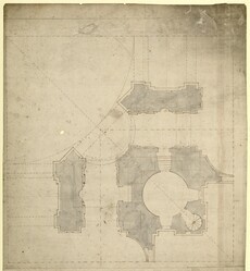 - DescriptionA near-final plan of the south-east quarter, which includes outlines of triforium-level walling on the inner sides of the bastions and over the crossing piers. Drawn by the unidentified draughtsman (fl. 1675-c.1687). Datable 1675. Drawn scale, just under 6 ft to 1 inch (10 ft = 42.5 mm) below the east-west axis (the drawing is inverted for comparison with others in this sequence). The faces of the pier masses and bastion walls are as built and the larger dimensions are very close to those in the fabric. The vault over the diagonal bay is now a full semicircle and reaches across the ribs between the pilasters at the inner ends of the piers and bastions, as in the built plan. Drawn in pencil over the crossing is an octagonal drum 135 ft in diameter between the parallel sides. This is 1 ft narrower than the octagon on the earlier quarter-plan, WRE/2/2/8, but represents a similar concept for the outer base of the dome, although no other drum is shown. Marked in pencil over the circular plan of the Dean’s Vestry is the octagon of the upper vestry; it corresponds to the plan begun at this level in 1678-79 (see WRE/2/3/13). Preliminary outlines for the walling at triforium level have been drawn in red chalk and pencil over the wall structure at church-floor level. Broken lines in red chalk indicate the upper (clerestory) walls of the central vessel at the angle of the crossing with block-like external buttresses; continuous outlines in pencil and red chalk probably mark slab-like structures at the springing of the tunnel vaults over the aisles. Nothing is indicated above the external walls of the aisles and bastions, however, where full-height screen walls were added from 1686. These first appear on WRE/3/2/1. The vaulted staircase up to the Dean’s Vestry is drawn with alternative parallel or splayed walls; it was built with splayed walls and with a deeper internal threshold.