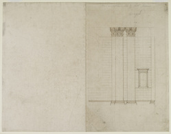 - BeskrivelseAn unfinished study-elevation of an east, north or south wall of one of the two eastern bastions. Drawn at least in part by Wren. Datable 1675 (pre-construction). Implied scale, just over 6 ft to 1 inch. The pencil preparatory technique and the careful, three-dimensional rendering in ink of the acanthus leaf and volutes of the Corinthian capitals suggest Wren's hand. The pencil inscription, ‘Break in Left hand side of North Entrance’, was added in the later eighteenth century, probably by Robert Mylne, who acquired a group of drawings in 1767 (see WRE/3/1/4, 5 and 7; WRE/3/2/8; WRE/4/1/4). The title suggests that the drawing shows the north elevation of the north-east bastion, with half a choir aisle to the left. However, it could equally show the east elevation of the south-east bastion, that is, the exterior of the wall shown in section on the left side of WRE/2/2/3. It postdates this drawing, as the basement is now at the built height of 9 ft and its windows are correctly positioned. The vestry window is also at the correct height but above this level the design is unresolved. The upper vestry window is indicated only by a void in the banded stonework and is set one course too low. The entablature is tentatively sketched with a deeply projecting modillioned cornice. This profile not otherwise recorded in the early phases of design and differs markedly from the near-final version in Wren’s two studies for the transept end, WRE/2/2/6 and 7.