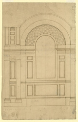 An early study for the aisle window bay in a section through the centre-line of the aisle vault, preparatory for WRE/2/3/4. Drawn probably by the unidentified draughtsman (fl. 1675-c.1687). Datable 1675 (pre-construction). Drawn scale, just over 4 ft to 1 inch (10 ft = 65 mm). The drawing explores the pattern of the vaulting in the concave window bay in intersecting circles of ribs which create lozenge-shaped coffers around the soffit. Wren used vaults of this type in the north and south internal recesses of the western vestibule of the Great Model. His source was the apse of the ‘Temple of the Sun and Moon’ (the Temple of Venus and Rome in the Roman Forum), as illustrated in Book IV of Palladio’s Quattro Libri (1570). The untidy and variable character of the pen lines and pencil sketching suggests a hand other than Wren’s: the bases of the pilasters, for example, are inaccurately drawn with over-large torus mouldings immediately above the plinths. The draughtsman set out the geometry of the lozenge-shaped vault pattern in the aisle window recesses and delineated all the moulding profiles up this level. He drew the circles from 11 groups of radius points around the window arch. These radial points relate in turn to the joints of 22 blocks around the arch of the vault, and coincide with the centres and intersecting ribs of the panels. In the finished design, WRE/2/3/4, Wren set out all the details with much greater precision. In the fabric the ribs and panels were reduced from 11 to 9 and their radiuses increased, so that their curves are steeper in relation to the circumference of the arch and their panels are closer to squares on plan. The section through the aisle vault is taken through the centre-line of the bay but spans the bay as a canopy, without a saucer dome. The saucer dome first appears in Wren’s early section through the transept end, WRE/2/2/6.