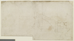 - DescriptionA study for construction above the level of the internal cornice, showing in half-section the internal attic, clerestory window, triforium roof with concealed buttress, and external balustrade. Drawn by the unidentified draughtsman (fl.1675-c.1687). Datable c.1679-83. Drawn scale, 6 ft to 1 inch. This drawing demonstrates that until 1685 Wren intended the cathedral to have single-storey aisle walls with a balustraded attic above the entablature (see WRE/3). The section is taken through the centre of a bay, looking towards a buttress on the line of the arcade pier and external pier mass. It shows the clerestory window in section, its internal and external sills, the aisle roof including the drip mouldings for the leadwork, the concealed buttress below the roof, and the stonework of the balustrade and wall passage. Dashed horizontal lines mark the zone of the design treated by this drawing: from the bottom of the internal cornice to the top of the internal attic. Masonry contracts of 18 July 1679 determined construction to the bottom of the internal cornice (Wren Society 16, pp.17-18), so this drawing probably belongs to the next phase. The internal cornice is shown without mouldings; it is at the built height of 3 ft 4 inches, but is set about 6 inches too high in relation to the external cornice. The drawing may therefore date between 1679 and early 1683, when this feature was being tried out in situ in model-form; see WRE/2/4/18. The internal attic above the schematic cornice is very nearly as built, with basement and cornice mouldings close to those in Hawksmoor’s working drawing for this feature, WRE/3/1/3. In both drawings, however, the sills of the clerestory windows are about 1 ft 6 inches higher than built. They were lowered when, mid-way through the revisions of 1685-86, taller flying buttresses were substituted for the shallower buttresses of this design; see WRE/3/1/10. The steeper buttresses rise through lower-pitched aisle roofs. These lower roofs allowed the sills of the windows to be dropped. In the marked dimensions, the draughtsman mistakenly wrote 8 ft 6 inches instead of 5 ft 6 inches for the height of the balustrade.