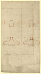 - DescriptionA study-plan of the walls and internal structure at triforium and clerestory levels and of the built plan at church-floor level. Drawn by the unidentified draughtsman (fl.1675-c.1687), Datable 1685-86. Drawn scale, just under 6 ft to 1 inch (10 ft = 43 mm). Drawn in red chalk are the screen wall above the aisle wall and the square timber posts and masonry pier responds which support the aisle roof (compare WRE/3/1/9 and 10). The flying buttresses are drawn without shading to indicate that they arch across the space to meet the outer wall at the level of the springing of the high vaults (after passing through the triforium roof). The buttresses meet the clerestory wall on this plan at 5-ft-deep pier responds. These responds were reduced in construction by about 2 ft to align with the pilasters in the aisles below (see WRE/8/2/1). In the fabric, extra timber posts were set in front of the responds to give added support to the roof beams and the thickness of the outer timber posts was reduced. The internal span of the buttresses was also reduced; they arrive at triforium floor level some 2 ft 6 inches in front of the wall piers shown on this plan. Pencilled dimensions between the square posts and the edges of the buttresses ('10 - 3 ½’ and ‘11 - 9’) suggest a concern with regular spacing of supports for the beams between the bays.