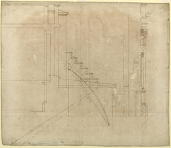 - DescriptionA half-section drawn by Edward Pearce on the centre-line of an upper bay, and including a revision to the arc of the flying buttress. Probably some pencil-work by Wren. Complementary to Hawksmoor’s fair copy with amendments, WRE/3/1/11. Datable 1685-86. Drawn scale, 3 ft to 1 inch. Pearce’s hand is evident in the rightward-slanting numbering in the scale bar and the freely handled pen outlines and horizontal shading in the capitals. His section is the earliest known profile through the upper half of the building to show the screen wall at its full height, with a flying buttress rising through the triforium roof rather than wholly contained beneath its slope, as in WRE/2/4/21. The buttress now meets the piers of the upper wall at mid-height and the slope of the triforium roof has been reduced, allowing the sill of the clerestory window to be lowered; compare WRE/3/1/3. This suggests that Wren left the design of the flying buttress and triforium roof until quite late in the revision process. Pearce first drew the arch of the buttress on a steeper profile, but then redrew it to meet the wall pier 3 ft lower. The radius of this arch is drawn in broken red-chalk outlines from a lower centre, just off the base of the sheet, and is marked in pencil, ‘40 - 0’ [ft]. This is the built radius, 40 ft being a repeated module in the design as a whole. In WRE/2/4/21 the radius is 30 ft. Further pencilled dimensions in feet and inches are: (i) ‘24 - 0’, for the height from the base of the buttress to the junction of its arch and the clerestory wall; (ii) ‘18 - 0’, for the internal width between the clerestory wall and the wall pier behind the screen wall; and (iii) ‘29 - 4’, for the diagonal line that forms the chord of the buttress arch. Two refinements take the design of the screen wall closer to the executed versions: the capitals are Composite rather than Corinthian and the keyblock of the triforium window has the relief carving sketched in pencil on WRE/3/1/9. Two other changes were not taken further: the lower plinth course is separated from the upper one by a channel, and the sill of the triforium window has been dropped to floor level, in line with the top of the external cornice. Triforium windows of this type only occur elsewhere in a preparatory south elevation by Hawksmoor for the Revised design (private collection; see Downes 1988, p.33 [‘the Redmill fragment’], and Higgott 2004b, p.545). Wren's motive may have been to align the upper floor throughout the cathedral with the top of the lower cornice, since in the west elevation of the Revised design the floor of the upper portico is at this level (see Geraghty 2007, no.82).