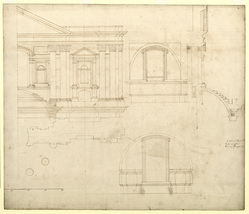 - BeskrivningA study for the right half of the upper transept end: elevation and plan on left, long section on upper right, and internal elevation of transept window on lower right. Drawn by the unidentified draughtsman (fl.1675-c.1687). Datable 1685. Drawn scale, 6 ft to 1 inch exactly. The hand is recognisable from the numbering of the scale bar and the flattened rendering in pencil of the leaves of the Corinthian capitals; compare WRE/2/4/10 and WRE/3/1/9. This is the first of three studies for the upper transept front; see also WRE/3/2/3-5. All deal with the relationship between the central upper window bay and the screen wall above the aisle. The design of the screen wall in this drawing relates closely to WRE/3/3/5, a scheme for the upper elevation of the western body, datable 1685, in which the pedimented aedicule is set high within the sub-frieze between the capitals, and the entablature mouldings of the aedicule are continued across the wall below the sub-frieze. On this drawing the band of entablature mouldings has been lowered to join with the columnar frame of the upper transept window and the sub-frieze between the capitals has been removed. The upper window is set high in the elevation, so that its segmental pediment nearly touches the bottom of the upper entablature. No channelled stonework is drawn and was probably not intended in this variant scheme. At the next main stage, WRE/3/2/5, Wren lowered the aedicule and upper transept window, reduced the dome of the portico by one step of masonry, dropped the entablature band by a full masonry course, added channelled walling, reintroduced the sub-frieze, and revised the design of the triforium window head. The arch of the transept vault is marked on the elevation in broken ink lines. Its curve determines the profile of the inner frame of the window, which on the elevation (although not on the section) is shallower and lower than the curve of the external frame. This discrepancy led Wren to lower and then flatten the external window arch. The half-plan shows, in ink, the walling at church-floor level, although without the aisle window recess. Drawn in pencil is part of the structure at upper level. Dashed pencil outlines mark a passage running through the wall at triforium level. The passage widens within the screen wall but does not open into the gallery space above the aisle, as in the fabric. An early study for section through the upper transept front on the reverse of WRE/3/2/6 shows this passage at the level of the external frieze and cornice, as in the half-section through the triforium of c.1679-83, WRE/2/4/21. A half-plan of the transept end in 1678-79, WRE/2/4/12, shows an incomplete wall passage, similarly positioned, and widening above the aisle. The present half-plan may therefore show the line of the passage in the first phase of the design, 1675-85, before the addition of the screen walls. By contrast, the section on the right-hand side of this drawing shows the passage at a higher level. It was built a few feet below this point, level with the top of the internal cornice. The draughtsman has written in ink near the lower right edge of the sheet a legend for the letters ‘A’ and ‘B’ (beneath dashed ink plumb lines) and ‘C’ (within the wall passage): ‘A Naked of ye Rustick below [i.e. front of lower wall] B Axis of ye sphere [i.e. centre of circle of portico vault] C pasage of flying up steps’ Letter ‘D’ on the plan of the internal pilaster of the transept arch is not explained. Inscribed on the clerestory window on the flank wall are the dimensions ‘9 - 0’ (in pencil and ink) for the width of its opening, and ‘11 - 0’ for the internal width of its architrave.