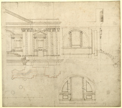 - DescriptionDrawn by the unidentified draughtsman and inscribed by Hawksmoor, this neat copy embodies the changes on the flaps (a), (b) and (c) attached to WRE/3/2/3 and 4. Datable 1685. Drawn scale, 6 ft to 1 inch. Red-chalk shading marks the line of the passage on the plan nearly as built. Not yet resolved is its upper level and the number of steps down to the triforium gallery. About 13 steps are drawn in pencil in two flights. These may be steps up from the passage that Wren initially intended to run across the transept front at a lower level (see WRE/3/2/3). In the fabric there are eight steps down from the passage to the original floor level in the transept galleries: an initial flight of three steps down to the point where the passage cants inwards, and then five steps down to the triforium gallery floor (reduced to one step when the gallery floors were raised from the 1930s onwards). Scribbled pen lines mark a revision of the internal frame of the transept window. The note ‘B’ to the right of the window frame is the centre-line of the pilaster that Wren was to add in a revision of this bay in WRE/3/2/12. It corresponds to the centre-line of the pilaster that frames the transept door, marked ‘B’ on this plan. This scheme for the upper transept front was used for the south elevation of the Revised design at All Souls (Geraghty 2007, no. 81). Reverse: On right side, pen study of an architrave with three fascias (perhaps an alternative for the architrave of the upper entablature on the front elevation).
