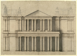 - Physical descriptionPen and brown wash over pencil under-drawing, with grey wash and pencilled additions. Thin laid paper; central vertical fold on axis of elevation. 35.7 x 48.9 cm. Watermark: Strasbourg lily WR; countermark: HD combined.