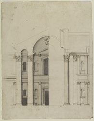 - [nb-NO]Description[nb-NO]A half cross-section and long section through the portico and narthex of the giant-order portico in WRE/3/3/3, with variations in the details. Drawn by Simon Gribelin. Datable 1685, but with pencilled amendment, c.1689. Implied scale just over 10 ft to 1 inch (10 ft = 24.5 mm). The pen technique in the column shafts, capitals and entablatures and the fine pencil under-drawing technique are consistent with Gribelin's hand on WRE/3/3/3. The smoothly graded washed shading is similar to that on Gribelin's west-east section through the north aisle at the west end, WRE/3/4/17. The inscription on the back is by Hawksmoor but the drawing itself bears no obvious signs of his hand and lacks a scale bar or any inscribed dimension. The left half-section is taken through the centre of the narrow bay behind the front columns of the portico: it shows the wall elevation of the central five bays of the west front, the profiles of their small and large vaults, and the outer profile of the roof and entablature. On the right is a west-east section through the centre of the portico showing the side wall of the narthex and the profiles of the entablature, pediment and roof. The distance between the centre of the aisle and centre of the nave is 41.5 ft (102 mm on the drawing). This compares with 39 ft in the fabric and suggests a date before the start of construction at the west end in March-April 1686. However, in the treatment of the wall bays the design supersedes the earliest known complete elevations of the west front with a two-storey portico (Geraghty 2007, nos.82-84). The aisle door has a straight entablature carried on columns, rather than the segmental-headed surround, and the architrave is carried around the side and rear walls as a continuous moulding to frame the wall bays, the planes of which are set back behind square angle-columns. In the upper tiers the angle-columns continue as strips of wall framing niches and panels. By setting the wall surface back within the bays, Wren added depth of relief within the narthex in response to the scale and massing of the columns. Gribelin helped to express this relief in pen and wash. Wren adopted this bay system for the lower portico of the executed scheme. In two detailed designs drawn by Hawksmoor at the next stage, he lowered the imposts of the niches by about 2 ft 6 inches to align with those of the large concave recesses in the tower bays; see WRE/3/3/10 and 11. The small staircase windows in the flanking bays were also repositioned. Written in pencil on the panel over the central door, and continuing in a fourth line across the architrave below, is a partly illegible inscription referring to Charles II, William and Mary, and Sir Christopher Wren as architect: ‘II F. M. HOC D. PAUL VETVS / CAR. II REG. ANNO MDL / ABSOL [...?] GVIELMO III. E. MAR II. R.R. NC ARCHITELC / AB EQVITE CHRISTO WREN’. The third line of the inscription, referring to William and Mary, is an addendum which extends beyond the centre-line of the half section; it appears to have been written over the erased text of the final line, which was then displaced to the architrave below. The revised inscription suggests that the design was still under consideration when William and Mary ascended the throne in February 1689. Construction was then about 9 ft above basement level on the north side of the west end but did not extend to the paired columns of the portico until the late 1690s (see Wren Society 14, p.47; and 15, p.50). Setting giant square columns against the paired pilasters of the aisle bays was just possible in 1689. A related half-plan at triforium level shows this revision being made, but in a sketchy, unresolved fashion (see WRE/6/1/1). Reverse: Inscribed by Hawksmoor on the back of the sheet in pencil, vertically against the lower right-hand edge: ‘Grand Portico Scanti Paulu’.