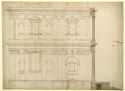 A complete study of the north elevation of the western body, including the western steps. Drawn by Hawksmoor but probably with some pencil-work and pen additions by Wren. Datable 1685. Drawn scale, 6 ft to 1 inch. Characteristic of Hawksmoor’s hand are the triple-dot marks for divisions in the scale bar, the vertical pen shading on the leaves of the Corinthian capitals, and the dense ruled hatching to denoted the recessed plane of the portico and steps (a convention borrowed from contemporary French engravings). Wren may have contributed the swags of drapery, fruit and leaves in the lower frieze and the fluently drawn keyblock of the concave recess. The elevation belongs near the beginning of detailed design-work for the two-storey western body, portico and steps. In the pencil under-drawing, the concave recess of the tower bay is set at the higher level found in WRE/3/3/2, its arch touching the soffit of the lower entablature. In the ink drawing the arch and imposts of the recess are set lower down. This adjustment determined the positions of the small niches in the adjoining chapel bay and in the narthex of the portico, since both sets of imposts align; see WRE/3/3/10 and 11. At the next stage in the design, a window replaced the niche in the concave recess; see WRE/3/3/8. In the upper storey, the pedimented aedicules framing the windows are set high in the sub-frieze between the capitals and their entablature mouldings run directly beneath this frieze. When designing the screen walls Wren used these pedimented frames to enclose niches and triforium windows but set them lower in the wall and removed the entablature band beneath the sub-frieze; see WRE/3/2/2-5. These revisions are indicated by crossings out in ink on the upper elevation in this drawing. Hawksmoor sketched consoles in the frieze of the upper entablature in pencil and ink. These features were redesigned several times before the start of work at the west end in 1686; see WRE/3/3/12. The wall elevation of the chapel has arched windows in the outer bays; these could not have been accommodated internally and were changed to niches in WRE/3/3/8. The pencilled dimension ‘32 . 6’ against the upper pilasters on the left, in Hawksmoor’s hand, is an instruction to correct a subsequent design. They were built 32 ft 6 inches high but scale at just under 32 ft on this elevation. The pencil cross-marks on both levels of the elevation appear to denote zones of walling intended to receive channelled walling rather than corrections.
