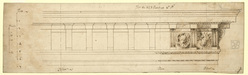 - DescriptionDrawn by Hawksmoor to the same scale as WRE/3/1/1 and 2 (3/5 inch to 1 ft, i.e. 1 : 20), and with similar handwriting, but probably with preparatory lines and additions by Wren in pencil. Datable 1685-86. The scale marked ‘Minutes’ derives from the diameter, or module, of the upper Composite columns and pilasters (3 ft 3 inches). Sixty minutes were used to proportion parts of the entablature in accordance with Renaissance precepts. Vertical broken lines, marked ‘Pillor’, denote the centres of the columns or pilasters and correspond to their positions in the fabric. The profile of the entablature is very nearly as built: the top moulding was increased by about 3 inches to bring the overall built height to 7 ft 3 inches; the consoles were given shorter channelled flutes and the carved ‘metopes’ between them were omitted; and the egg-and-dart motifs between the consoles were enlarged to read more clearly from a distance. Sketched in pencil on the right are the plan and section of the rosettes between the consoles and a sloping line above the top moulding for the shedding of water. The sheet was trimmed at the bottom, leaving the profile of the top moulding of the entablature, presumably a superseded design. Reverse: Two pencil sketches. A smaller sketch, probably in Hawksmoor’s hand, is a schematic elevation of a console, marked ‘1’, in relation to bay divisions marked ‘17’ between broken vertical lines. These lines relate to the spacing of the column centres, which scale at 16 ft 4 inches on the front elevation. Drawn to the right of this, in the opposite sense, is a more tentative large-scale profile of the top moulding and console surmounted by a blocking course with a stepped top surface sloping back from the front. The lightly sketched, broken pencil lines in the blocking course suggest the hand of Wren.