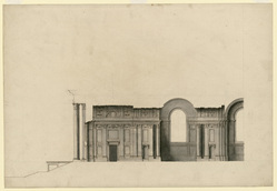 A record drawing of a long section through the north aisle, looking north, from the middle of the third bay of the nave to the western steps. Drawn by Simon Gribelin, probably for engraving. Datable c.1686. Implied scale, just under 10 ft to 1 inch (40 ft = 104.5 mm). In the wall elevations of his western aisles, Wren repeated features he had used on the walls of the bastions and crossing piers and in the vaults of the aisles. Gribelin rendered several of these features inaccurately: the plinth at the base of the aisle wall should be in two courses, the upper one stepping back between the plinths of the Composite pilasters (compare WRE/2/2/5); the section of the arch of the aisle door recess should rise to the top of the fascia above the cornice of the Composite order and not to the top of the cornice; and the vault should be differently patterned and have narrow, horizontal panels at the bases of the ribs. These narrow panels are present in Gribelin's sections through the west end, WRE/3/4/18 and 19, and nave, WRE/3/2/10. In technique the drawing demonstrates Gribelin's mastery of grey-wash shading. The shading is smoothly 'washed in' from one tone to the next, with finer nuances of shadow expressed in slender bands of wash. The aisle recesses are washed over in a darker tone to indicate depth, and a darker layering of wash is applied to the easternmost aisle vault, furthest from light entering through the aisle door. The wash has been applied over finely drawn brown ink lines. These have not caused any blotting or bleeding of colour into the wash. For a similar technique, see WRE/3/3/4 and WRE/7/3/1. At All Souls is a companion study, probably in Gribelin's hand, for the internal elevation of two bays of the choir aisle; it is drawn at the same scale, and has similar freehand outlines and grey wash shading (Geraghty 2007, no.78).