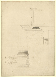 - DescriptionTwo studies, in section and elevation, for the gallery and upper stall front, and the base and pedestal of the columns. Drawn by Hawksmoor. Developed from the design with curved west stalls, WRE/4/1/8 and 9. Datable c.1693. Implied scale, 2 inches to 1 ft (1 : 6). The gallery front in the upper study is a large-scale reworking of the section on the left side of WRE/4/1/9. It shows: ‘A’, the projection of the cornice of a proposed canopy above the wider Bishop’s seat in the centre of one range of stalls; ‘B’ the projection of the gallery cornice over the adjoining stalls and the profiles of its panelled soffit; and ‘E’ the relief ornament and frame moulding of the pier of the stall beneath the gallery. Added in pencil to the soffit of the stall is the section of an intended panel. Hawksmoor continued the mouldings of the cornice across the sheet in pencil and drew an incomplete reflected plan of the square soffit panel below these, 2 ft by 2 ft (with diagonal construction lines in the lower half). This is the soffit of an intended flat canopy above the Bishop’s stall. At the next stage, WRE/4/1/12, he changed the canopy to an open-base segmental pediment, making the panel redundant. In anticipation of this change, he deleted the cornice ‘A’ on the present drawing in scribbled pencil and marked in heavier pencil a deeper supporting cornice carried on a large bracket. This bracket reaches down to the top of the stalls. He drew it fully in elevation in WRE/4/1/13. It prefigures the winged-cherub brackets carved by Grinling Gibbons in the completed enclosure in 1695-97. Below is a detail of the column bases and the remarkable curvilinear marble pedestals of the choir screen. They first appear in WRE/4/1/8 and 9 and were executed close to this detail but with stylised water-lily leaves instead of acanthus on the angles, and with a separate acanthus scroll on the column plinth. Two pedestals survive with their columns in the internal porch of the south transept created by Penrose in the 1870s from salvaged features of the re-ordered choir enclosure (another on the north side was destroyed in 1941). The column base in this drawing is the enriched Corinthian version used for the main internal order (see WRE/3/1/2). Two cavetto mouldings and a pair of tondino mouldings separate the upper and lower torus mouldings instead of the single large cavetto found in the plainer version of the Corinthian base used on the outside of the building. To the right, a small sketch marked ‘D’ shows the profile of the cornice of the marble pedestal concealed by the overlapping leaf moulding. Hawksmoor wrote a legend for the whole drawing to the left of the pedestal: ‘A The projection over ye Bps / seat. / B The projection of ye Gallery / C The Plinth at ye front of / ye Quire. - marble. / D Moulding of ye said P. / E the Pilaster supporting ye / Gallery &c [et cetera]’; and in the top right-hand corner: ‘(9’. This bracketed number one of several Hawksmoor wrote on drawings in c.1693-94; see also WRE/2/1/4, WRE/4/1/12 and 16 and WRE/5/2/6. Reverse: Incomplete pencil study design for part of the choir aisle screen (see WRE/4/1/14-16), drawn probably by Hawksmoor. A pair of engaged Corinthian columns 10 ft 11 inches high, on a common plinth 1 ft 9 inches high, carries an entablature 2 ft 4 inches high (the columns were increased to 11 ft 3 inches in the fabric; see Poley 1927, pl.27). Set back on the right is an incomplete column shaft spaced at the same distance as the paired columns, probably drawn as a trial study, since in the choir aisle screen a door is placed immediately to the right of the paired columns. The capitals are variants of the standard Corinthian, having a tall upper leaf in place of the usual central flower and a bead moulding along the top of the abacus.