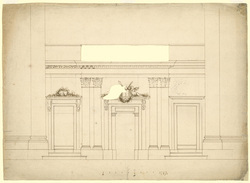 - Physical descriptionPen and brown ink over pencil under-drawing, with grey-brown wash and amendments in pencil. Thick laid paper, stained brown on left and right edges, with two areas cut out to remove sculpture or relief ornament (over the door and in the balustrade), and with modern repairs to small tears on all four edges. 38.0 x 52.7 cm. Watermark: Strasbourg lily WR.