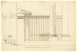 A study by Hawksmoor for the wrought-iron screen shown on the plan, WRE/4/3/1, with a section through the stalls on the north side, east of the reading desk. Datable c.1693-94. Drawn scale, just under 2 ft to 1 inch (5 ft = 129.5 mm). The pencilled note on the right, ‘A Lower’ is an instruction to lower the horizontal bar marked ‘A’ in the centre of the main panel. The panel between the column and the outer pier has thinner, more closely set posts. The section on the left side is taken through the east side of the north range of stalls, looking towards the east apse. It shows the two steps up to the rear stall and the profiles of the cornice to the wall panelling and the stone-carved frieze above this, just below the sill of the chapel window. The design was superseded by the timber screen in WRE/4/3/3.