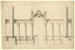 - DescriptionAn initial study for the carved timber screen. Drawn by Hawksmoor as a revision of the wrought-iron screen in WRE/4/3/2. Datable c.1694. Drawn scale 9/16 inch to 1 ft (5 ft = 70.5 mm). In the completed screen, carved by Jonathan Maine in 1697-98, a continuous stone plinth runs beneath the screen. It returns outwards either side of the entrance to support two columns for the pediment on each side, round in front and square behind. On this drawing the round columns - sketched with Corinthian rather than the Composite capitals carved by Maine - are in the same plane and stand on separate plinths. A revised plan, sketched in pencil at the upper left, shows the entrance bay closer to the finished scheme, with a round column set forwards of a square column. A large-scale pencil study at All Souls presents a near-final version of the pediment in half-elevation and reflected plan (Geraghty 2007, no.102). The frieze of the entablature is level with the stone frieze which runs around the chapel interior beneath the aisle windows (see WRE/4/3/2). Both were carved with with Vitruvian scroll ornament, sketched here. Dotted outlines indicate the timber column concealed behind the larger stone columns of the aisle arcade on the left side. Reverse: Inscribed along the top right-hand edge, in pen and brown ink in an unknown hand, probably early eighteenth century: ‘Entrance to the Chaple S P.’.