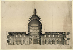 - DescrizioneAn engraved long section in perspective view, looking south, at proof stage, lacking a title and scale. Engraved probably by Simon Gribelin; annotations and sketched corrections by Hawksmoor. Datable c.1687. Implied scale, 20 ft to 1 inch. This engraving records the design of the interior of the cathedral soon after the start of work on the west end in 1686. The perspectival cutaway convention, centred on the dome, probably derives from an engraved long section of St Peter’s in Rome by Alessandro Specchi in 1687 (Higgott 2009, fig.147), a source that may have prompted Wren to adopt the double-shell form of the St Peter’s dome at this stage in the design. It must be earlier than 1693, when the roof structure above the eastern arm was begun with more closely set trusses and the choir floor was designed with steps between the third bay from the crossing and the apse (see WRE/4/1/5). Simon Gribelin is the only engraver known to have been active in the St Paul’s office in the late 1680s (see WRE/6/2/7); his hand is present on WRE/5/1/3. The engraving was prepared to complement two prints based on drawings of c.1686-87 at All Souls (Geraghty 2007, nos.81, 82): a north elevation, derived from the All Souls south elevation (St Paul’s Collection SP105; see WRE/5, fig.1), and a west and east elevation on a single sheet (Wren Society 14, pl.11). Like the north elevation, SP105, this long section has a single-stage attic above the columnar drum, in place of the double attic on the All Souls south elevation, and a lantern on a high concave base. The tops of segmental-headed windows in the attic are drawn in outline at the base of the internal dome, above a truncated dome which conceals these windows from view at church-floor level. This arrangement derives from Jules Hardouin-Mansart’s Invalides church in Paris (1677-1706). Wren would have known its design from engravings published in 1683 and 1687, the latter including a section on the diagonal axis by Pierre Lepautre (Higgott 2004b, 541-47; Higgott 2009, fig.148). In the Invalides dome columnar buttresses rather than windows stand on the cardinal axes, so the attic windows are not shown in this long section. However, they do appear on the left side of WRE/5/1/3, a design which revises this version of the dome and presents the section differently. In April 1703 Wren was reimbursed £225 retrospectively for money he had laid out personally for four copper plates which included this one (‘A Large Section in Perspective from East to West’; Wren Society 15, p.94; see also Downes 1994, pp.40-46). A later version of the engraving, dating probably in the mid-1720s, shows the peristyle with radial arches and inner dome with a central oculus, as in the completed structure (Wren Society 14, pl.9). It bears title panels, a scale bar and a number (‘Tab 10’) in the top right-hand corner, and belongs with a group of similarly numbered prints of St Paul’s, including four of the Great Model (one dated 1726), assembled by Wren's son Christopher for an aborted publication, A Specimen of the Works in Architecture of Sir Christopher Wren (see Wren Society 14, pp.xii-xiv, pls.1-5, 9, 11; Harris 1990, Geraghty 2007, no.105). Hawksmoor’s note, in pen and brown ink at bottom right, is an instruction to the engraver - presumably Gribelin - to correct the plate; it refers to letters and sketched profiles which he had marked on the print: ‘Cover the first faces all / over very faint --- / mend ye Spandrells. / R mend them blotts / S Rub out / T mend the Attick / Souls Window mend / V make the Torusses as at V / W mend ye sides of ye Windows / projectition [sic] of Cornice. / ye great Architrave about ye Arch of ye dome’. Marked on the print in pen and brown ink, from left to right, are letters and sketched amendments, some relating to the above instructions: (i) Left of apse cornice and above roof over apse: two sketches of the pendant flower in the middle of the coffered arch above the narrow bay. (ii) Over pier on east side of narrow bay: horizontal pen shading (illustrating the instruction to cover the ‘first faces’). (iii) In the vaulting rib between first and second bays from east: ‘V’. (iv) In left reveal of middle clerestory window of choir: ‘W’, with vertical pen shading in the reveal and the left reveal of the first window. (v) In opening of middle clerestory window: ‘R’. (vi) In left drum and pier mass of the dome: revisions of profiles of dome and tambour cornices and lip moulding of cove. (vii) In left side of lantern peristyle: ‘S’ and deletion of rail feature. (viii) Within and to the right of the right drum and pier mass: sketches of cornice profiles at every level.