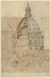 - Fysisk beskrivningPen with brown and grey inks over incised lines and pencil under-drawing, with red chalk additions, pen and pencil shading. Four conjoined sheets of laid paper pasted on a ruled-pencil ledger sheet. 46.8 x 30.4 cm, mounted on a modern paper frame, 51.7 x 35.5 cm. (i) L-shaped main sheet (left section and half-plan), in darker paper, brown-stained from glue backing, 34.1 x 29.7 cm; (ii) inner sheet in angle of ‘L’ (drum and attic), 11.2 x 9.5 cm; (iii) upper sheet (outer dome), 8.9 x 9.7 cm; (iv) top sheet (lantern, cut out around profile), 8.8 x 4.4 cm. No watermarks or countermarks visible.
