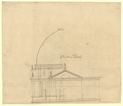 An incomplete scheme for a dome with pedimented porticoes in the peristyle. Drawn in ink by the unidentified draughtsman associated with the west end and dome (fl. c.1685-91); pencil-work by Wren. Reverse: pencil sketch by Wren or Hawksmoor of a five-bay villa. Datable c.1690-91. Implied scale, 20 ft to 1 inch. The ink drawing in this design is in the same hand as four others for the dome from c.1690-91, when Wren was developing alternatives for a 24-bay dome; see WRE/5/1/6-9. A design for a lantern on the reverse of WRE/5/1/11 and eight drawings for the west end in c.1685-86 can also be assigned to this draughtsman: WRE/3/3/9 and 13, WRE/3/4/4-7, 12 and 14. He was unskilled in perspective and the rendering of curved features in elevation (see especially WRE/5/1/6). Balusters are drawn as abbreviated ‘S’ shapes, capitals and bases as bell-shaped profiles, parapet figures as ovals with pin heads, and the freehand pen lines of leaf and vase ornaments have an undulating quality. The scheme offers a striking alternative to the 16-bay dome in WRE/5/1/1-4. The central and flanking bays of the main axes are framed by three-bay porticoes which mirror the upper transept fronts. The diagonal bay of the dome has a wide window in the peristyle and an oval one in the attic, an arrangement which looks back to the dome of the ‘Penultimate design’ in 1675 (Geraghty 2007, no.77). The drum is octagonal at the level of the peristyle but curved in the attic at the base of the outer dome. The straight rear walls of the porticoes are therefore set back behind the curved wall of the attic. This massing arrangement is sketched in pencil on the right side of the half-plan in WRE/5/1/4. Loosely sketched in pencil on the outer dome is a network of intersecting ribs. They spring from divisions of the 16-bay dome marked by piers and pedestals in the attic and recall (in larger scale) the spiral openwork form of the lantern in Wren’s design of 1666 for a dome over the crossing of the pre-Fire cathedral (Geraghty 2007, no.46). Also added in pencil are a low inner dome rising only a short distance above the attic, a pedimented projection in profile on the right, and a semi-circular domical projection on the diagonal bay. The pen inscription across the dome, ‘Dome S.t Pauls’, appears to be in Hawksmoor’s hand. Reverse: Pencil sketch by Wren or Hawksmoor of the elevation of an unidentified, five-bay villa, presumably c.1690-91. The basement has straight flights of steps either side of the central bay; the raised ground floor has arched windows and a wider, pilastered central bay with an arched door recess; and the attic has square windows and a pediment over the central bay. The whole is framed by broad end-pilasters. Above is a hipped roof with tall end-chimneys and a square central pavilion with a Venetian window and a pyramidal roof. It may be an early study for Northolt Rectory for Charles Alston, Archdeacon of Essex and chaplain to the Bishop of London, for which there are designs in Hawksmoor’s hand, c.1692, similarly in five bays with a hipped roof but lacking a roof pavilion; see Geraghty 2007, no.332.