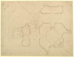 - DescrizioneAn eighth-plan of the dome, showing an unexecuted scheme for the lower drum immediately above the Whispering Gallery, but including elements of the peristyle; developed from WRE/5/2/6; drawn over a quarter-plan of the crossing, but trimmed on left side. Datable c.1694-95. Drawn probably by Hawksmoor. Drawn scale, just under 6 ft to 1 inch (10 ft = 43 mm). The eighth-plan is of the drum beneath the peristyle, as no pilasters are drawn. However, windows are included in the inner wall, and the radial walls join with square bases or pedestals. These stand above the outer wall of the drum. Two levels appear to be shown simultaneously, but the main level is probably at the base of the drum, immediately above the Whispering Gallery. The implied internal diameter is 114 ft, compared with 108 ft between the arches at church-floor level. This is 2 ft more than the built diameter at this level (112 ft). The outer diameter exceeds the fabric by 1 ft 6 inches (141 ft 6 inches compared with 140 ft). It appears to be an early study for a drum with a sloping inner wall. No other drawing survives to illustrate the design, but it dates after WRE/5/2/6, as the radial walls now have passages on their inner sides and the pier masses have semi-circular staircase shafts in their outer halves.