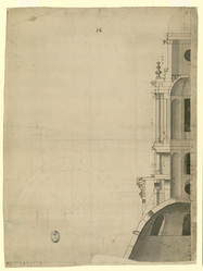 - DescriptionA marked-up half-section, on the cardinal axis, of the top of the cone and the lantern to the base of its timber-framed dome, including (left), a part-plan of the top of the cone in pencil. Drawn by an unidentified draughtsman associated with Edward Strong. Same provenance as WRE/5/3/9. Datable 1706-07. Implied scale, 4 ft to 1 inch. Omitted from the section are: the timber and lead-clad outer dome, which was to meet the wall at the base of the lantern immediately below the outer console; the wrought-iron gallery railing, made by Thomas Robinson in 1708 (Wren Society 15, p.167); and the timber-frame capping, ball and cross (see WRE/5/1/11). In January 1707 Edward Strong’s masons were paid for ‘33 days in Modelling the Cap of the Cone & Foundation of the Lanthorn’, and ‘For a Modell of Wood with its Embellishments for the Lanthorn’. In June that year they finished for two further masons’ models: ‘one of the Crown of the Arch or Cone & Foot of the Lanthorn, &c.’ (Wren Society 15, pp.147, 152). This section only concerns the masonry construction of the cone and lantern and is preliminary in some details at the lowest level. The technique of annotating every single dimension in section and elevation is similar to Strong’s; see his working drawing of the upper apse in c.1685-86, WRE/3/1/6. The smooth washed shading is more characteristic of Hawksmoor or Dickinson, but the annotations are not obviously theirs, so the drawing could be the work of an assistant of Strong’s, already proficient in washed shading. The section is not quite as built (see Poley 1927, pl.VI): the arched windows at the top of the cone were reduced in height and the windows in the intermediate drum of the lantern were enlarged. The pencil plan of the top of the cone on the left does not match the section; it may have been be an initial guide for its layout, modified in the ink drawing. These discrepancies suggest that the drawing was probably prepared for the first of Strong’s models in January 1707. In March 1708 Strong modified the ‘10-Inch Wall’ around the base of the lantern while making alterations and additions to the ‘Modell of the Entablement [entablature]’; in August his masons were paid extra to alter the ‘Cap Mould [drip moulding] to the pedestal under the pillars’ (Wren Society 15, pp.161, 165). Thus, small changes to the design, including alterations to the built fabric, were made during construction from mid-1707 to November 1708, when the ball and cross were gilded; see WRE/5/1/11. Strong received final payment for this complex masonry structure in January 1709 (Wren Society 15, p.172). Reverse: Inscribed in pen and brown ink, top centre, in an eighteenth-century hand, ‘St Paul’s’.