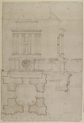- TitoloElevation, plan and half-section of the clock/belfry and lantern of the north-west tower. Reverse: elevation of a fluted Doric column