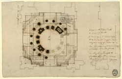 - Physical descriptionPen and brown ink over pencil with green-brown wash and additions in pencil and darker brown ink with pen shading. Laid paper, corroded in places by thick iron gall ink used for revisions to the plan; repaired tear at top left. 24.8 x 38.3 cm. Countermark: ‘L’ with ‘AK’ conjoined (same as WRE/6/1/9).
