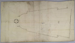 - DescriptionAn incomplete, unrealised project, developed from WRE/7/1/1, for rebuilding the frontages around the precinct on a nearly symmetrical plan which narrows to a pair of quadrant ranges framing the entrance to Ludgate Hill, to the south of which is a rotunda on axis with the cathedral. Drawn by Hawksmoor. Datable c.1696-97. Scale, about 25 ft to 1 inch. Drawn at double the scale of the study-plan, WRE/7/1/1, this finished scheme sets arcaded frontages around the perimeter of the churchyard on the same wedge-shaped plan. The main axes of the cathedral (marked ‘Cent’ at the crossing) are parallel to the edges of the sheet, and the long axis runs through the middle of the rotunda on the west. The rotunda has 16 engaged columns on the exterior and a four-apse plan within. It is closely modelled on Wren’s unrealised project for a mausoleum for Charles I at Windsor Castle in 1678 (Geraghty 2007, no.293); see WRE/7/1/3. A double flight of stairs rises within a curved parapet wall on the west side to give access to a raised principal floor. It could have accommodated a monument in the western apse, opposite the entrance. The scheme as a whole would have required the demolition of almost all the houses around churchyard and a large group on the south side of Ludgate Hill. The eastern terrace, beyond the apse, incorporates the three-part elevation of St Paul's school. Reverse: Drawn in faint pencil is the plan of a large, L-shaped building, probably at lower-ground elevation, consisting of one long range, drawn vertically in the middle of the sheet, with a projecting 3-bay central pavilion and four bays each side. It is linked by a quadrant wall to another range along the edge of the sheet, with two rectangular projecting staircase bays and narrower bays between them. Written in large letters over this plan in pencil, probably by Hawksmoor, ‘Pauls’.
