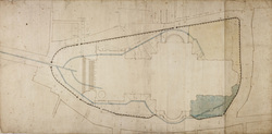 A survey plan of entire precinct, with the cathedral and street blocks in outline, showing the approved scheme for the churchyard railings, modifications to it, and the below-ground drains around the site. Drawn by Dickinson. Datable 1709-10; amendments c.1713. Drawn scale, 20 ft to 1 inch. On 28 January 1710 the Building Committee ordered that Richard Jones be contracted to make and erect a cast iron ‘Fence’ around the church, subject to any alterations that Wren should direct, and with a proviso that the statue of Queen Anne should stand within the enclosure. The railings were enclose ‘as much of the grounds of the Church-yard as conveniently can be’ (Wren Society 16, pp.108-09). This survey of the precinct incorporates a near-final scheme, after the demolition of the two blocks of houses on the north side (marked in dotted outlines). Probably dating towards the end of 1709, it supersedes the plan on WRE/7/2/2, in which railings on a narrower plinth create separate enclosures around the churchyard. Several revisions to the present plan, some of them deleted, indicate the reinstatement of the separately enclosed areas; these presumably followed Wren’s intervention after the scheme’s approval in January 1710. Added to the plan in black ink are straight sections linking the main railings to the north transept front. This scheme is illustrated in a detailed plan by Dickinson of 2 April 1713; see WRE/7/2/4. The executed scheme for the railings around the west portico is on a plan by Dickinson of the west stairs at crypt level at All Souls, dated 17 June 1710 (Geraghty 2007, no.110). This shows the reinstatement of straight sections of railings linking the north and south ends of the steps with the main railings. The completed railing enclosure, with its linking sections, is shown in mid-eighteenth-century engravings by R. Parr in the St Paul’s Collection (nos 55-57; Wren Society 14, pls 33, 34). Alternative positions for the statue of Queen Anne are indicated by faint pencil circles in the west churchyard, each with a brown-ink letter ‘R’ at its centre. The upper one is on the axis with Ludgate Hill, and the lower one (in the executed position) is on the west-east axis of the cathedral. The latter position avoids the underground drains, drawn in blue-shaded outline. Dickinson annotated the plan in three places to record the depth from ground-level to the crowns of the brick-vaulted drainage channels: (i), above the drain line in Ludgate Hill, ‘May 10th : 1710 / Mem.dm ye Draine here is 11 : 6 / from ye Surface to ye top of ye Crowne’; (ii), opposite the south-west angle, ‘Mem:dm ye G.t Draine here is / 7:f 8’ from ye Surface to ye / top of ye Crowne -- / & 4 : 6 Diam.r out to out’; and (iii), next to the west side of the north portico, ‘Mem.dm ye G.t Draine is [blank] / from ye surface to ye top of ye Crowne’. Dotted lines mark the public road and around the perimeter and Dickinson noted its width in many places. Notes in black ink, possibly in another hand, mark the names of buildings and plot owners on the north side of the churchyard.