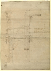 - DescriptionAn incomplete half-section through the choir and aisle showing the structure more or less as built by the mid-1690s but including a pencil-drawn proposal for a balustrade above the upper entablature. Drawn probably by Edward Strong, the balustrade probably an addition by John James in 1716; some pencil sketching possibly by Wren. Implied scale, just under 5 ft to 1 inch (40 ft = 7.8 ft). The handwriting of the inscription appears to be in the same ink as the drawing itself and resembles that of Edward Strong, especially in the ‘z’-shaped lower-case ‘r’ and secretary lower-case ‘c’ (resembling a ‘t’); compare WRE/3/1/6. The numbering in this inscription and the technique for the Corinthian and Composite capitals (with ruled divisions between tongue-like leaves) are also similar to Strong’s, although the hand as whole is more fluent than in his drawings from the 1680s. The drawing was probably amended in 1716 by John James, as there is a pencil study for a balustrade above the upper entablature. A ruled pencil line runs down from the balustrade across the sill of the clerestory window to explore the effect on light in the nave. Written in pencil above the base of the line is ‘att 5 foot high for ye midle of ye [cut off]’ (5 ft being the height from the top of the entablature to the middle of the balustrade). This note appears to be in the same hand as the main inscription, attributable to Strong. It could suggest that a balustrade was under consideration as the choir was being roofed. The section of the balustrade above the projecting pilasters has the profile of a baluster rather than of a pedestal. In a letter of 28 October 1717 Wren warned against ‘a continued range of balusters’ which could be blown over in high winds, and recommended the introduction of pedestals ‘where the pilasters are double’. This advice was followed in the built scheme (Wren Society 16, p.131; Poley 1927, pl.XII). The inscription is a note of three running totals in an addition of internal heights: ‘from the Paueing to the suffite [soffit] of the / single Ribbs or Arches upon the / great Pillasters .) 86.6 / thence to the top of / the brick vaulting ... 5 - 6 / the higth of the inside of the / church ... 92. wch is the bottom [cut off] / Entablature of the [cut off]’. Although accurate as a record of the fabric, the drawing is in error in two of its inscribed dimensions. The list of heights in the calculation adds 2 feet to the 40-ft height of the internal pilaster in the penultimate number; this is the height of the plinth of small order of pilasters, which stands in line with the base of the internal pilaster, and should be included in its height. The panel between the pilasters of the arcade piers is marked ‘3 . 8’ but should be 3 ft 4 inches wide. Omitted from the section are the top surfaces of the flying buttresses and aisle vaults. Roughly sketched in pencil on the drawing, possibly by Wren as well as James, are the lines of the lozenge-shaped coffering in the aisle recess (the coffering differs in the nave and transepts), relief ornaments around the aisle vaults, corrections to the profiles of the friezes of the aisle imposts, and additions to the triforium roof.