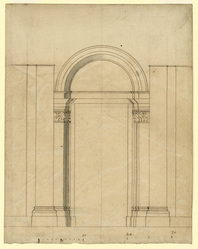 - DescriptionAn internal elevation of the recess, in the same hand as WRE/3/4/4 and 5. Datable 1685-86. Drawn scale, just over 6 ft to 1 inch. The elevation shows the splay of the west door recess and the paired pilasters on each side of the west nave wall. It was developed from a study at All Souls, annotated by Hawksmoor, for the internal elevation of the west door and aisle recess (Geraghty 2007, no.87).