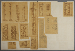 - Descripción físicaVarious studies of ironwork, including part of one of the St Paul's Tijou screens. The drawing is executed on 11 separate pieces of tracing paper, in ink and pencil. The drawings have been mounted on white paper.