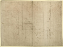 - [nb-NO]Description[nb-NO]A copy by Hawksmoor of Pearce’s section, WRE/3/1/10, but with small adjustments. Datable 1685-86. Drawn scale, 3 ft to 1 inch (10 ft = 86 mm). A neat re-rendering of Pearce’s drawing, save that: (i) the capitals are Corinthian rather than Composite; (ii) capping has been added in pencil to the buttress behind the screen wall and the coping has been continued across to join the top of the clerestory wall, to indicate a return flank of the screen wall at a right-angled junction; (iii) the profile of a saucer dome has been added to the high vault; (iv) stone courses have been marked in pencil in the clerestory wall; (v) a stepped structure has been added behind the screen wall, presumably at the right-angled junction; (vi) a higher roof has been sketched in pencil for passage at the top of the clerestory wall, level with the high vaults. The vertical shading technique on the Corinthian capitals is a clear indication of Hawksmoor’s hand at an early phase in the designs for the screen walls and west end (compare WRE/3/2/3 and WRE/3/3/5). Reverse: Drawn in pencil are: (i) the elevation of a pedestal with a central projecting band and a plain plinth; and (ii) a segment of a circle intersected by a straight line, probably related to the saucer dome of the high vault.